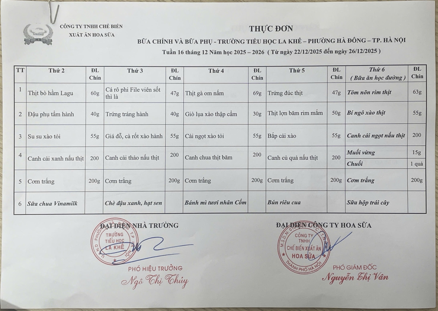 Thực đơn bán trú Tuần 16 tháng 12 năm học 2025 - 2026 (từ ngày 22/12/2025 đến ngày 26/12/2025)