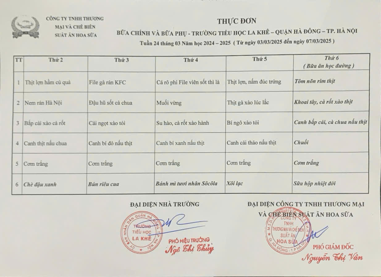 Thực đơn bán trú Tuần 24 tháng 03 năm học 2024 - 2025 (từ ngày 03/03/2025 đến ngày 07/03/2025)