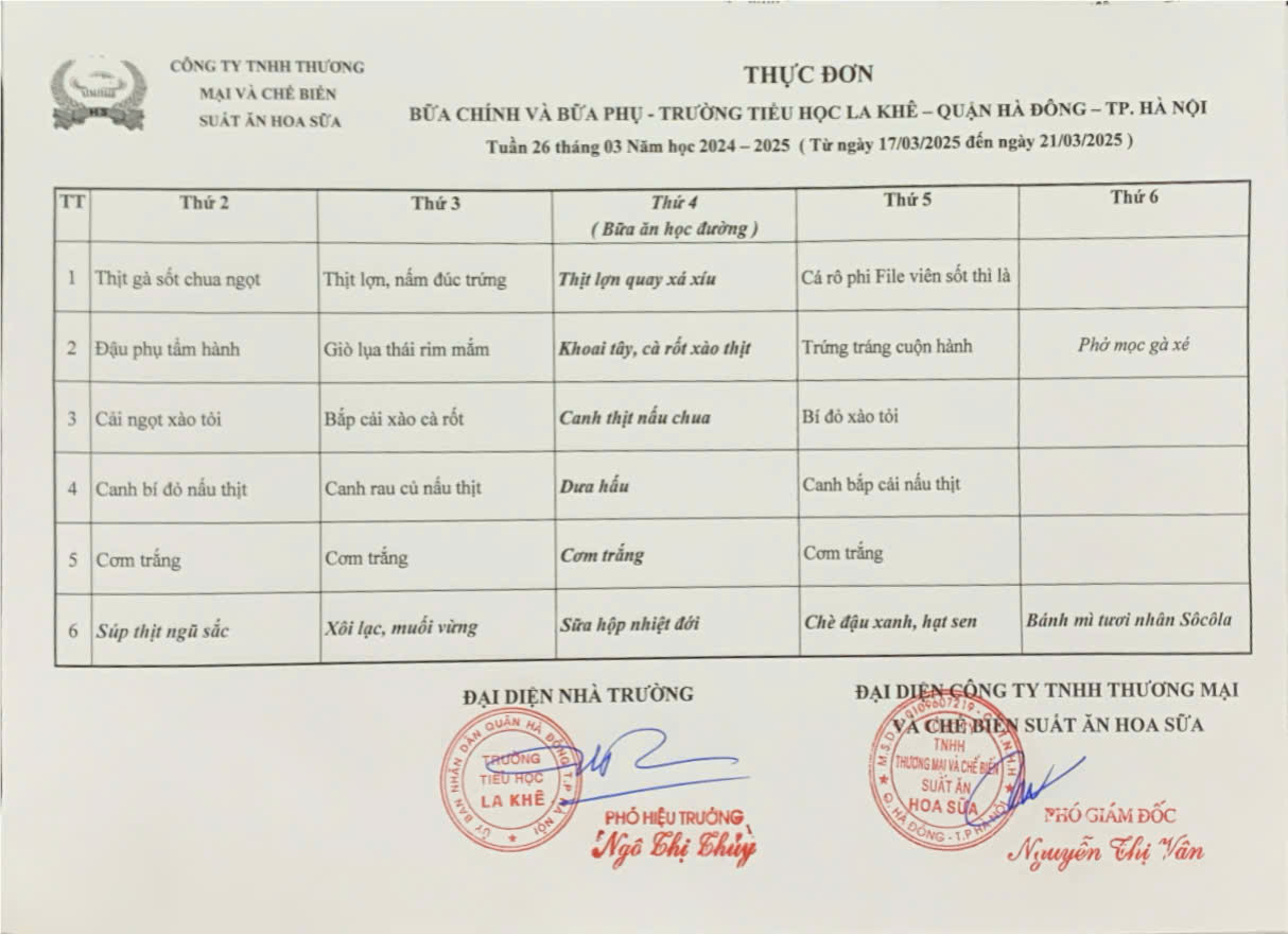 Thực đơn bán trú Tuần 26 tháng 03 năm học 2024 - 2025 (từ ngày 17/03/2025 đến ngày 21/03/2025)