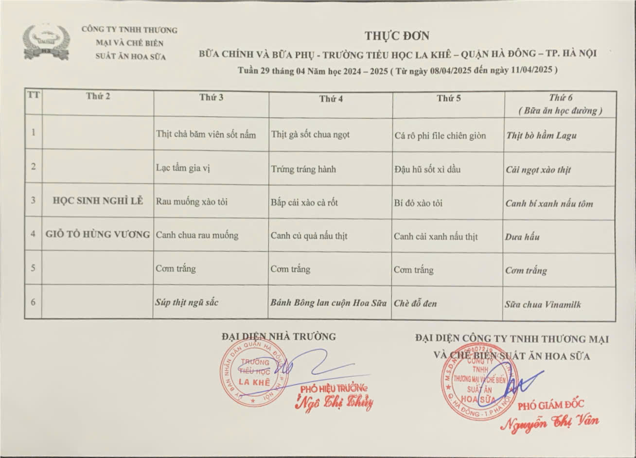 Thực đơn bán trú Tuần 29 tháng 04 năm học 2024 - 2025 (từ ngày 07/4/2025 đến ngày 11/04/2025)