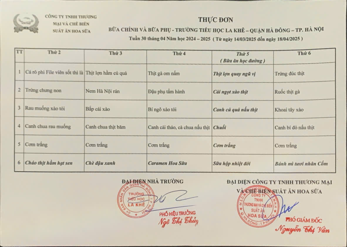 Thực đơn bán trú Tuần 30 tháng 04 năm học 2024 - 2025 (từ ngày 14/4/2025 đến ngày 18/04/2025)