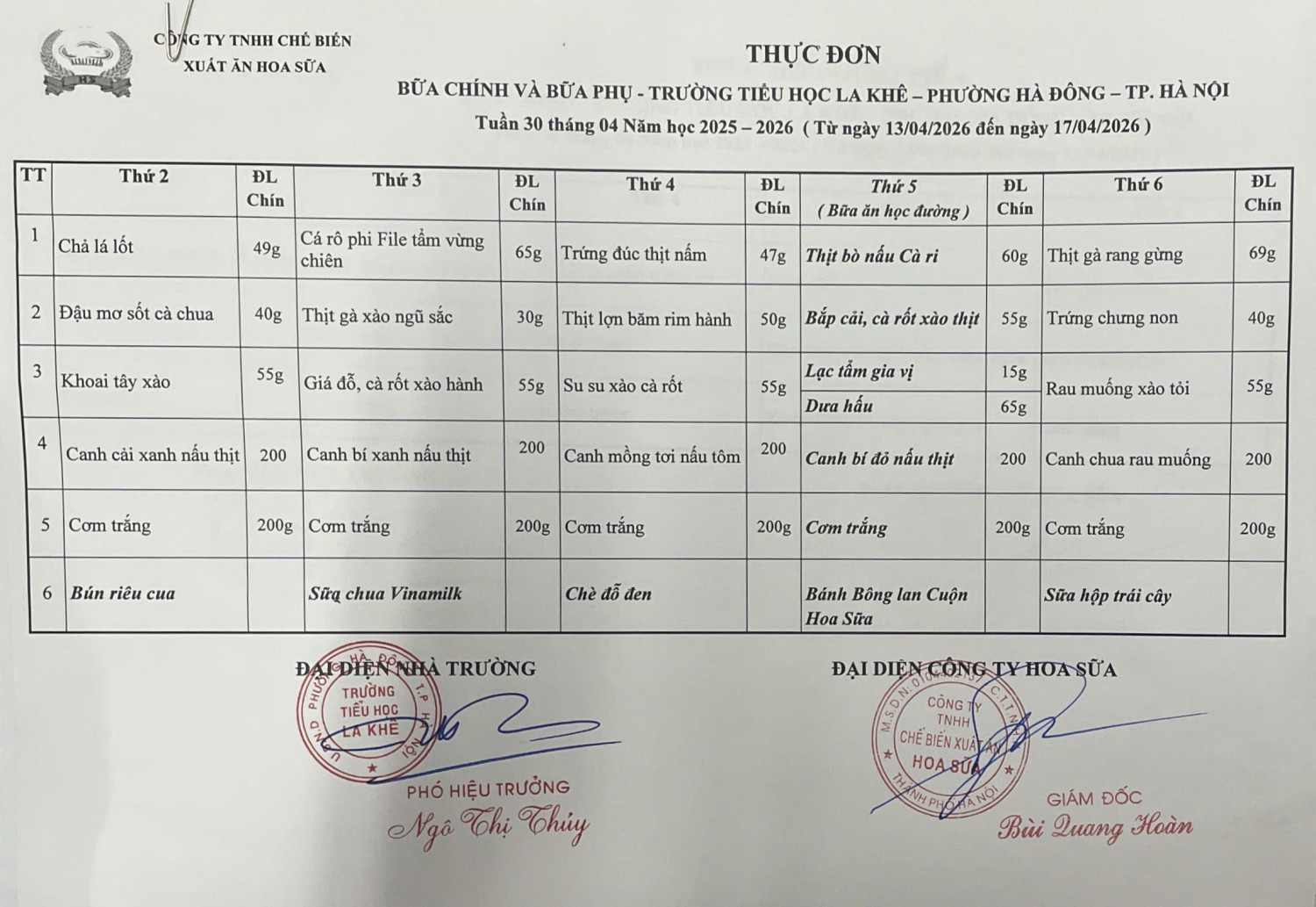 Thực đơn bán trú Tuần 30 tháng 4 năm học 2025 - 2026 (từ ngày 13/4/2026 đến ngày 17/4/2026)