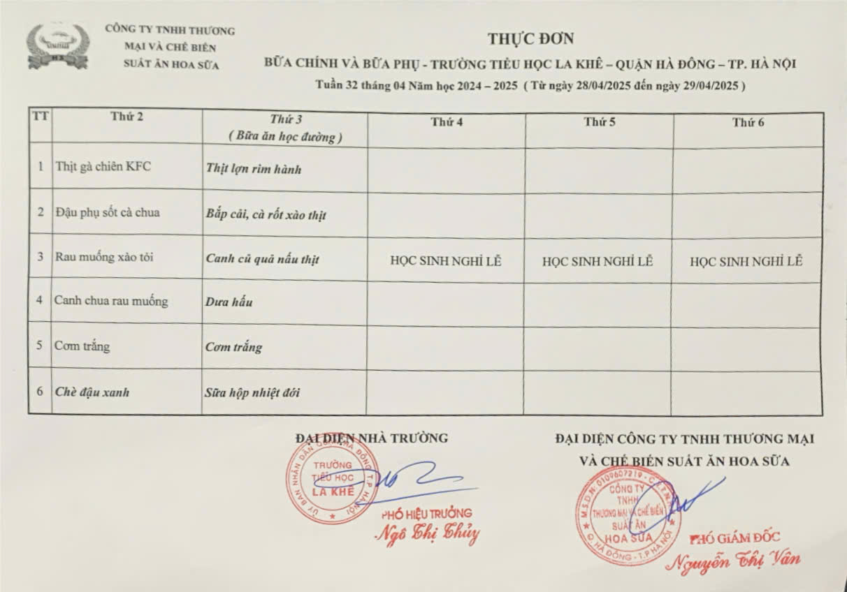 Thực đơn bán trú Tuần 32 tháng 04 năm học 2024 - 2025 (từ ngày 28/4/2025 đến ngày 29/4/2025)