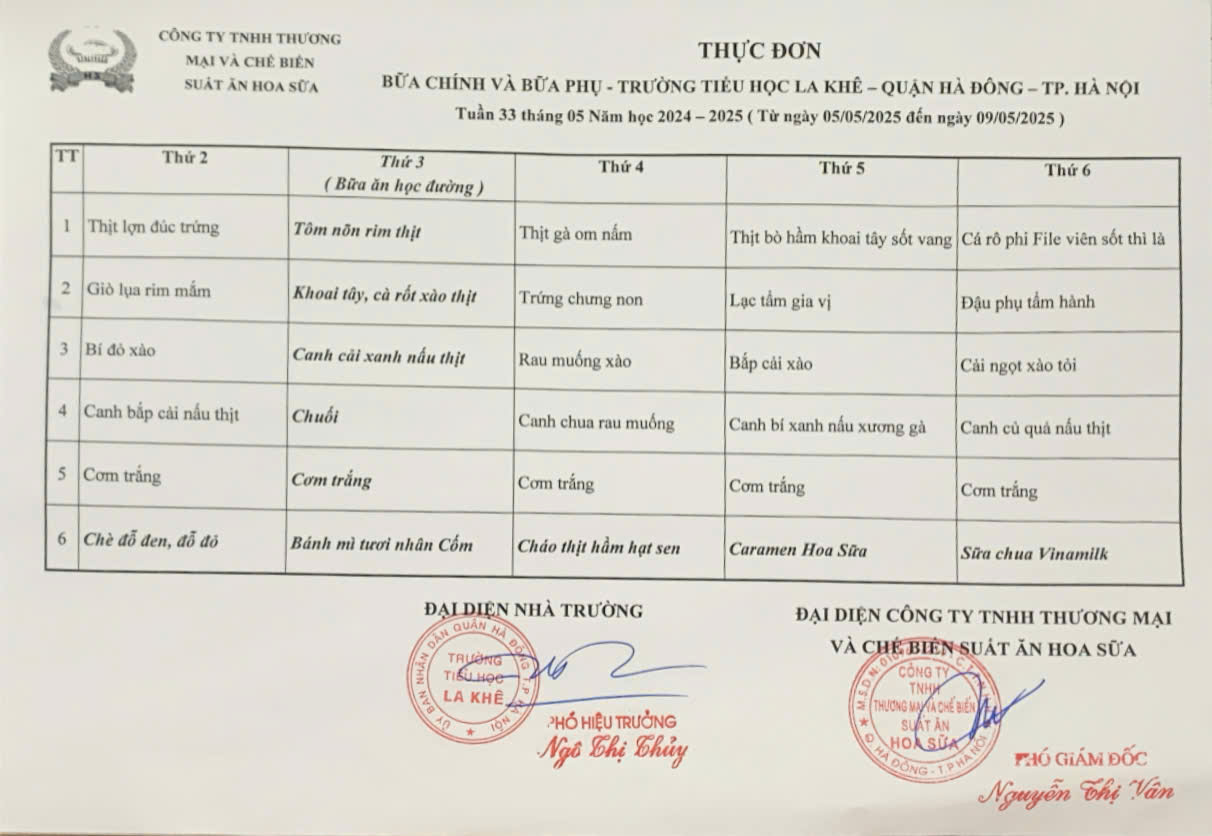 Thực đơn bán trú Tuần 33 tháng 05 năm học 2024 - 2025 (từ ngày 05/5/2025 đến ngày 09/5/2025)